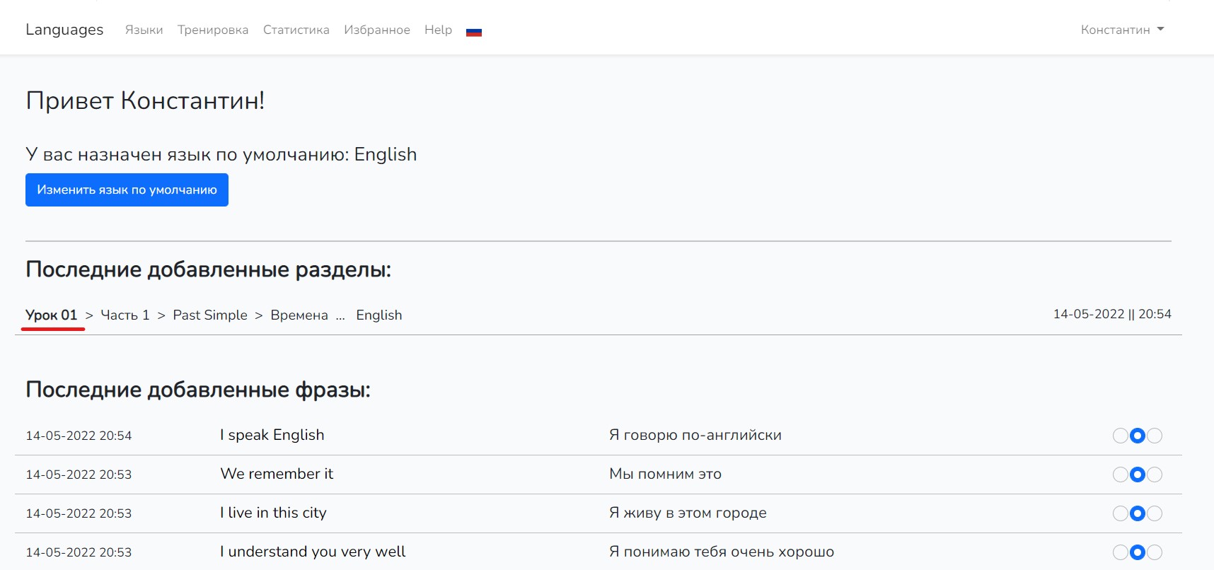 Вид главной страницы изменился с последнего нашего посещения. Мы добавили фразы в раздел и это видно на главной странце.