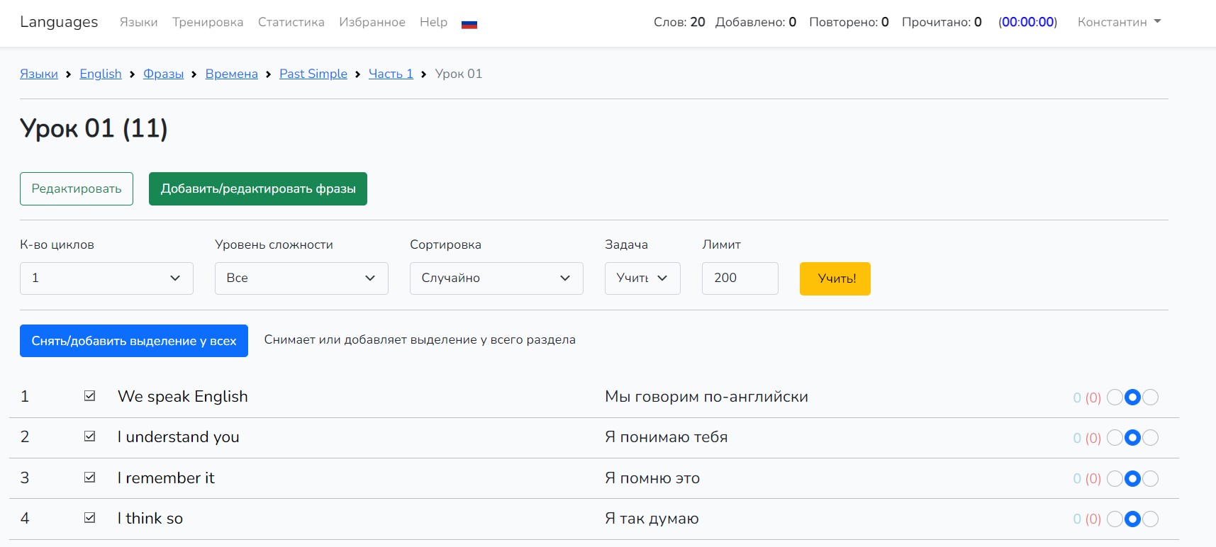 Если снять галочку, то эта фраза не будет попадать в упражнения. Снять или добавить галочки для всего