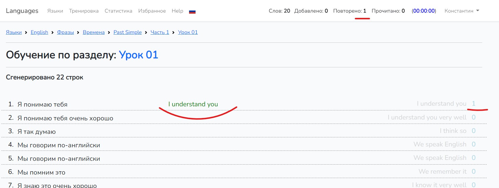 сейчас не 0, а 1. Также обновился счетчик в верхней панели справа. Теперь там стоит: "Повторено: 1". После первого правильного