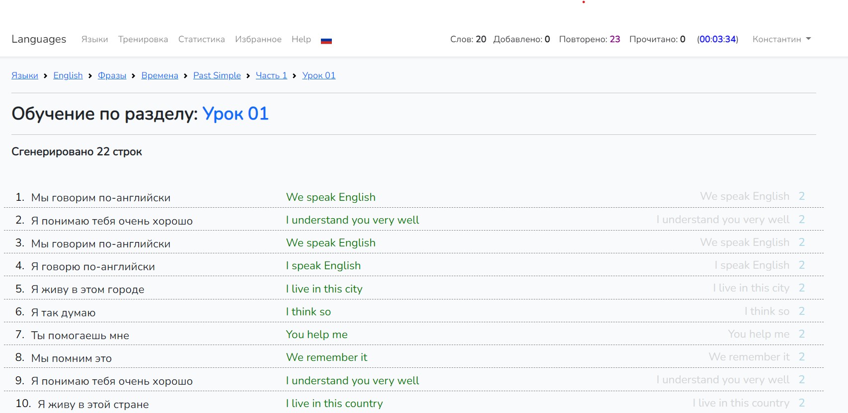 Сайт сгененировал для нас 22 строки. Это 11 фраз раздела, повторенные 2 раза и размещенные в произвольном порядке.