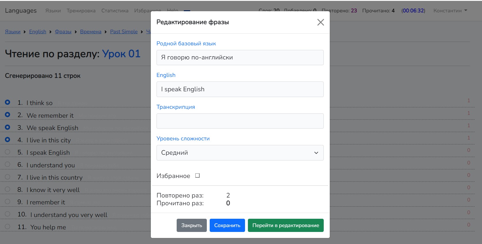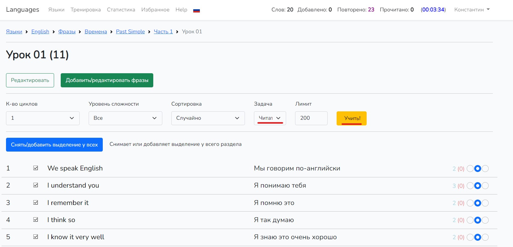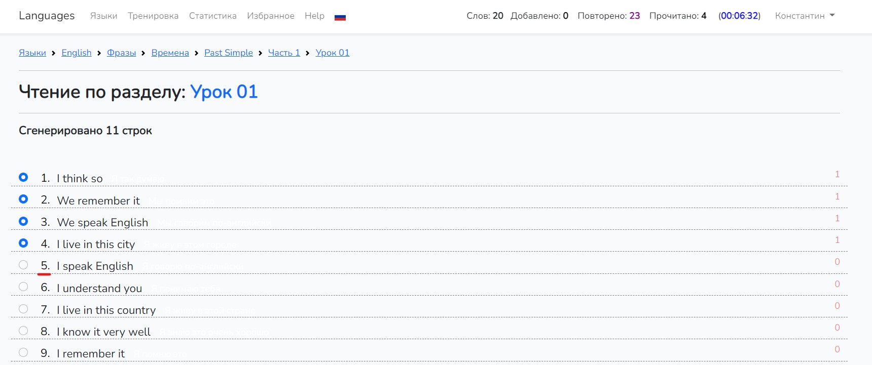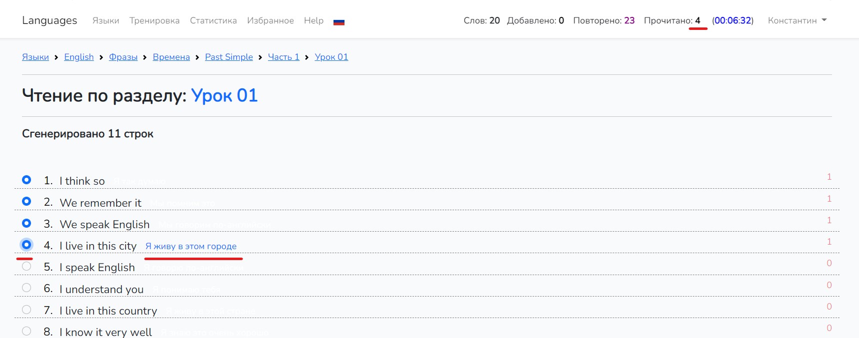5. Теперь давайте разберем как осуществляется упражнение по чтению фраз.