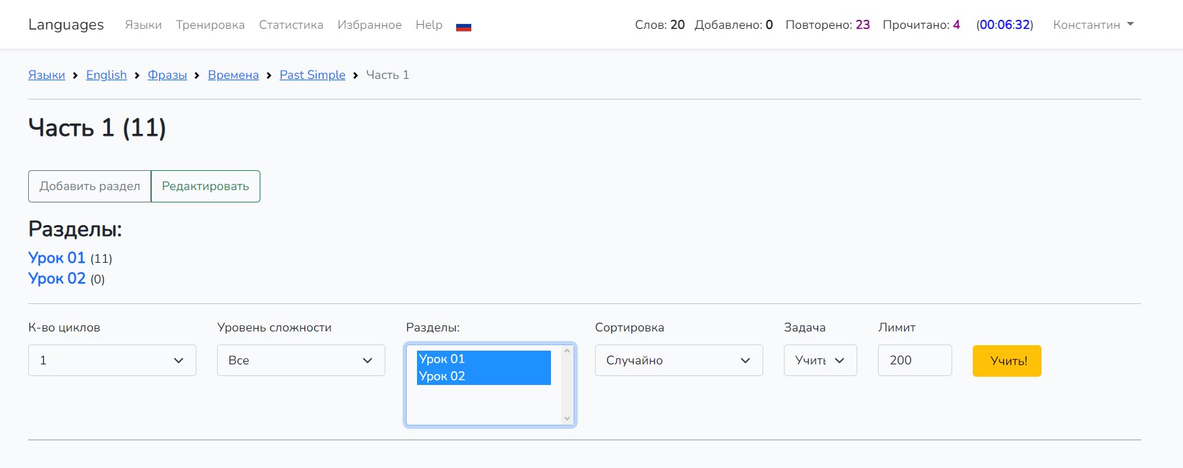 1. Для того, чтобы учить или читать сразу несколько разделов, Сайтом предусмотрены следующие опции: Давайте перерейдем в созданный родительский раздел "Часть 1" и создадим в нем еще один раздел и назовем его "Урок 02". Он находится в том же разделе, что и ранее созданный "Урок 01". И прямо из этого раздела мы можем сгененировать для обучения фразы сразу из двух разделов. Чтобы выделить их, нужно в форме выделить один раздел, а затем при нажатой клавише "Ctrl" выделить еще одни раздел и нажать кнопку "Учить!". Этот способ работает с любым количеством разделов и с помощью его можно тренироваться с повторением и чтением.