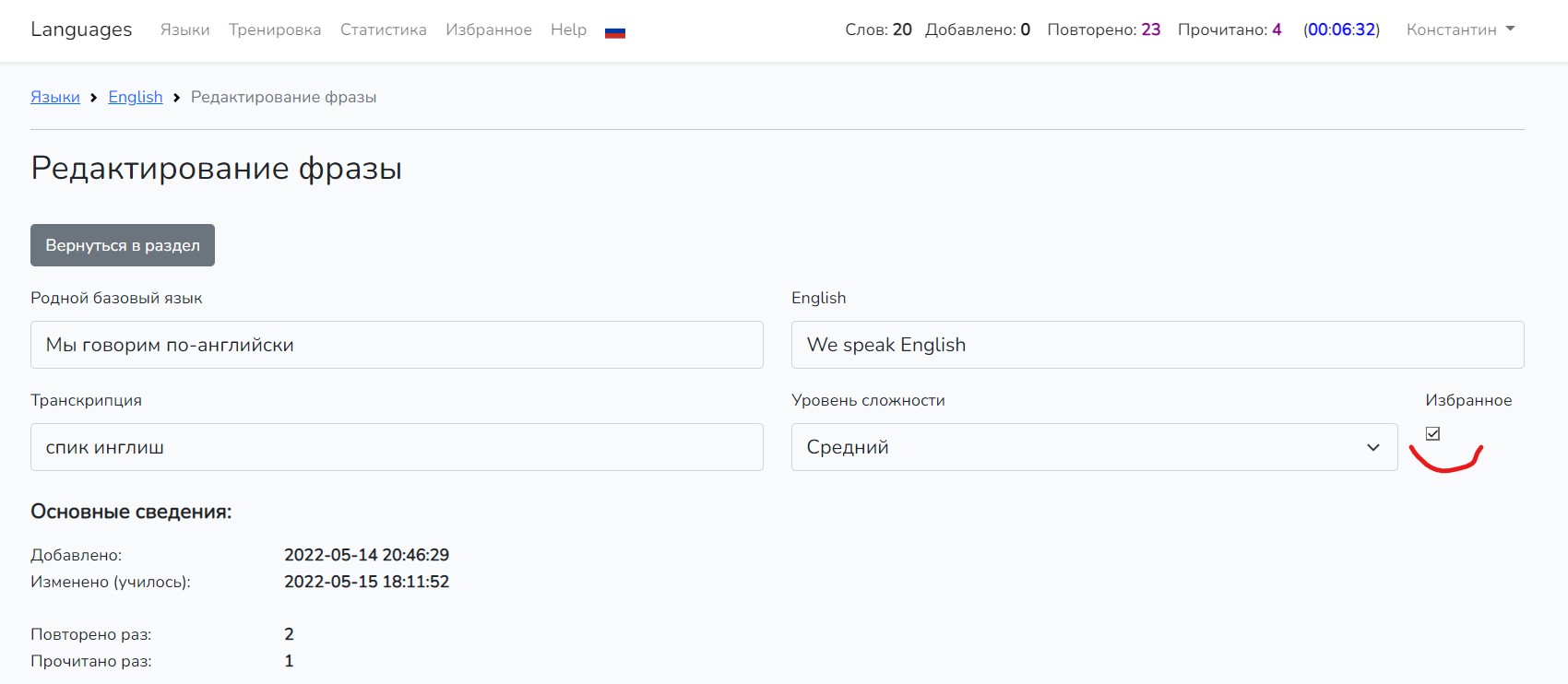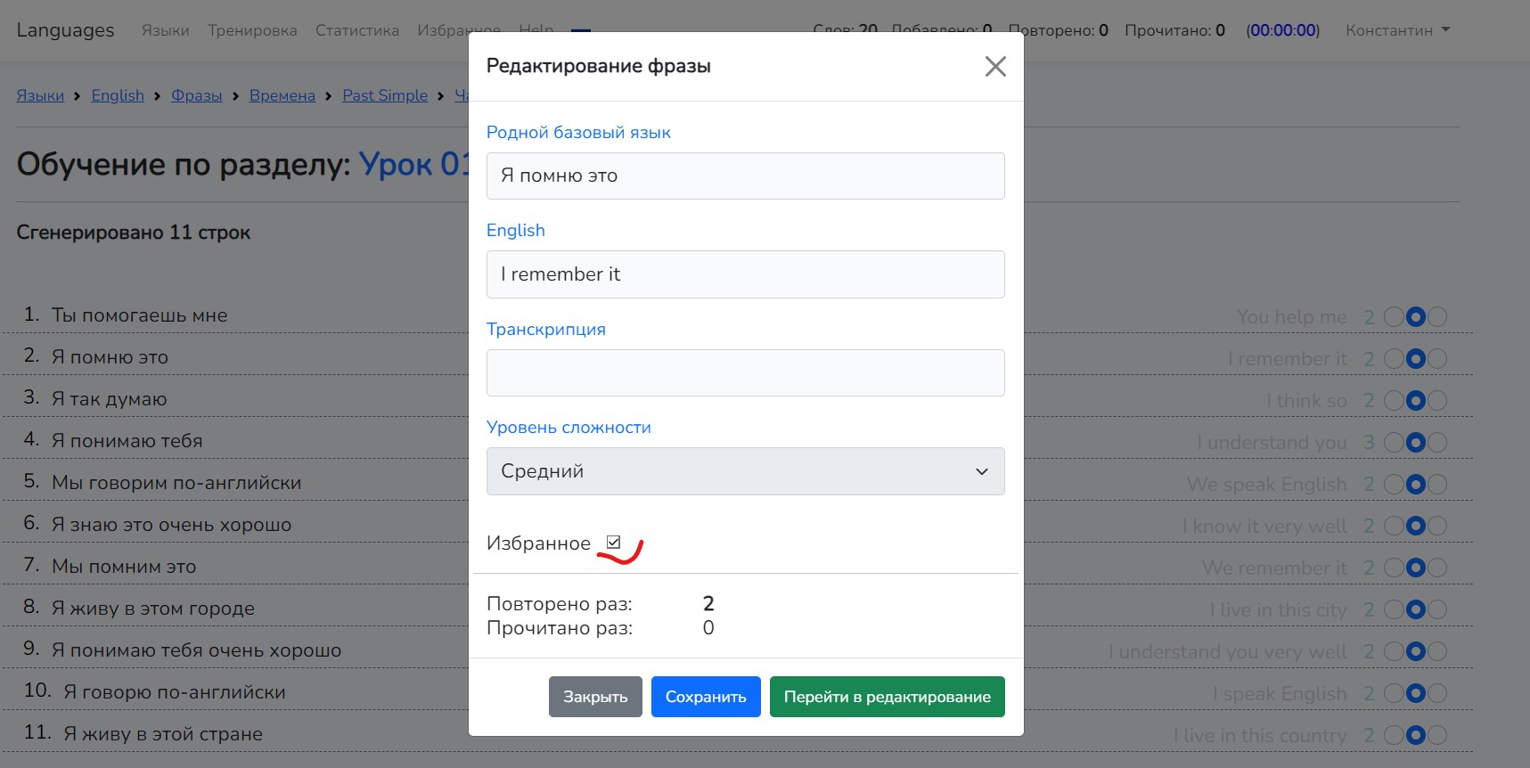 А также можно добавить в Избранное прямо из упражнения на повторение или чтение в модальном окне редактирования фразы. При этом как и в редактировании фразы, выбор можно не подтверждать. Просто поставить галочку в чекбоксе и закрыв модальное окно