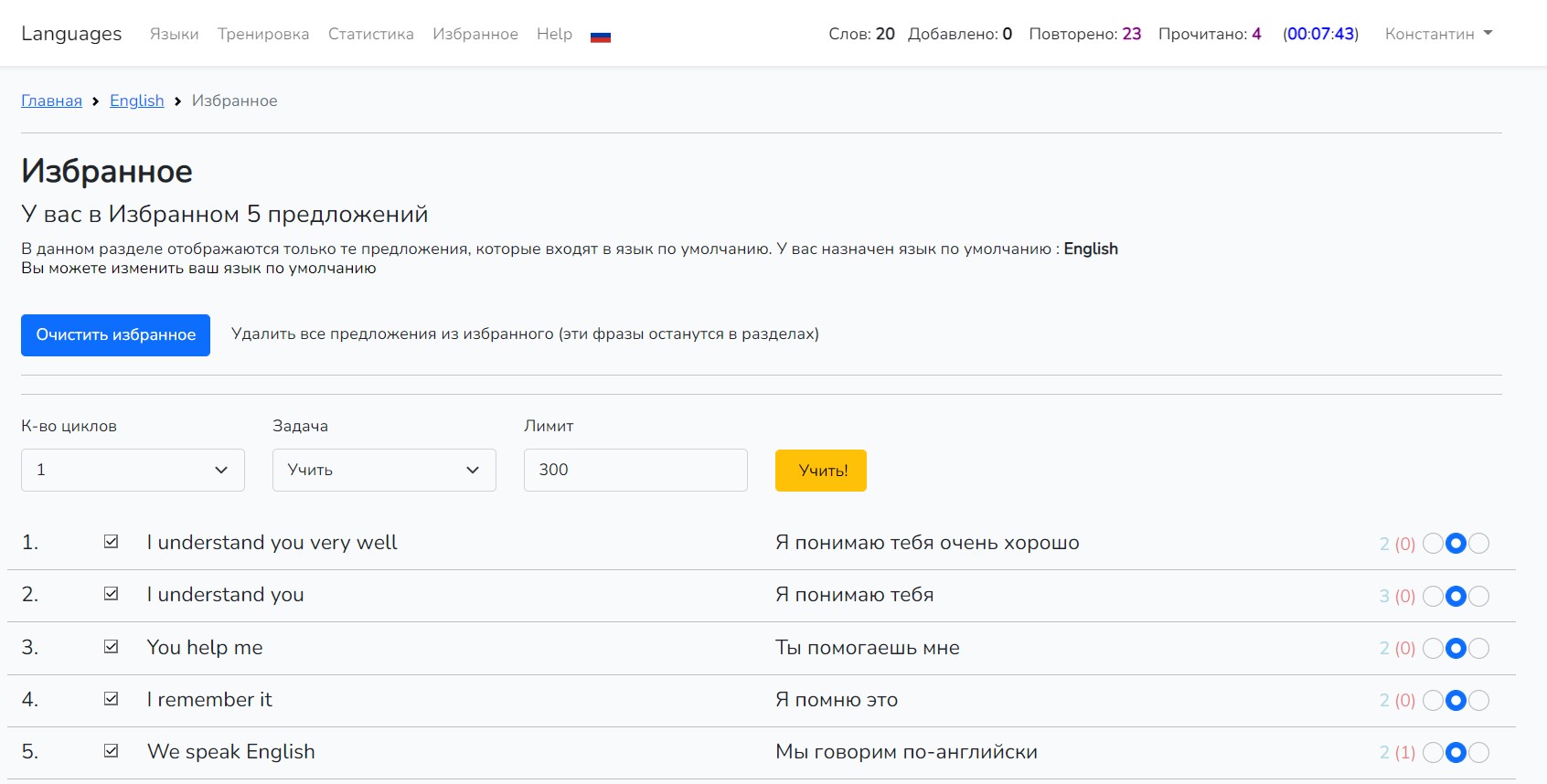 3. Я добавил 5 фраз в Избранное. Теперь их можно сгенерировать в упражнениях по повторению или чтению